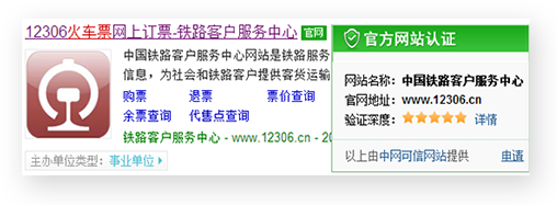 网民输入"机票"、"火车票"等关键词查找信息,可在搜索结果中便捷核验网站真实身份。