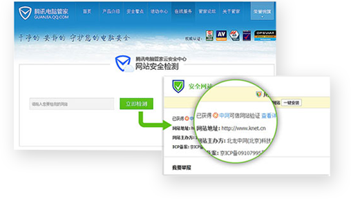 腾讯电脑管家云安全中心网站安全监测平台,已全面融合中网“可信网站”验证,查验待访问网站安全的同时,还可便捷查验网站的真实身份信息。