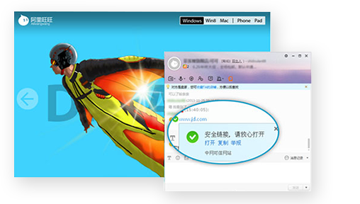 国内第二大即时通讯工具——阿里旺旺,已全面融合“可 信网站”验证,阿里旺旺用户在聊天框中接收他人发送的 网址、链接时,凡 是通过“可信网站”验证的正规网站, 将会有专属安全提示,同时,还允许阿里旺旺点击查验网 站真实身份信息。